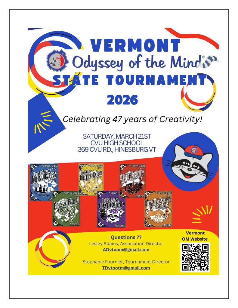 Vermont Odyssey of the Mind State Tournament: March 21st, 2026